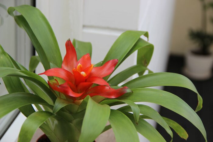 赤、黄色、オレンジの花がカラフルで可愛いグズマニア。筒状になった葉のなかに水を貯めて生育する、ユニークな特徴をもっています。
