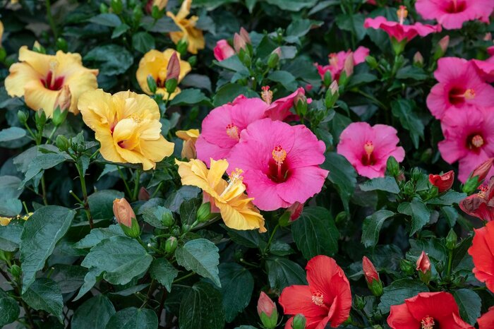 トロピカルフラワーの代名詞、ハイビスカス。ゴージャスな花は一日花で短命ですが、10月頃まで次々に花を咲かせます。