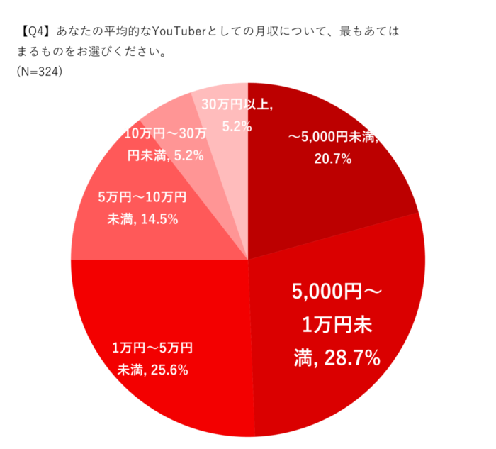 ファストマーケティングの調査によると、YouTubeで1ヵ月に10万円〜30万円の収益を得ている人は全体の5.2%。この人たちのチャンネル登録者数は、1万人〜5万人が41.2%と最多層です。この登録者数をクリアできれば、月10万円以上の収益が見えてくるようです。