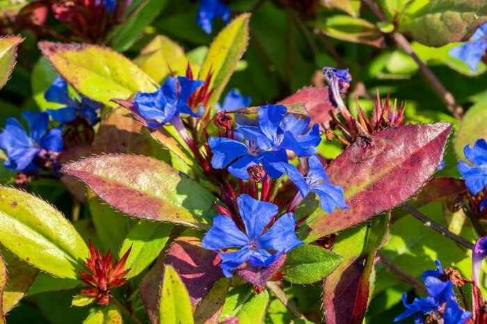 ルリマツリに似たブルーの花を咲かせるルリマツリモドキ。学名のケラトスティグマとも表記されます。