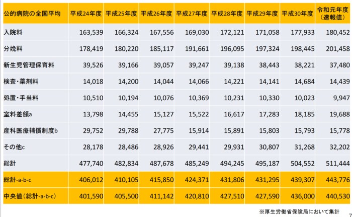 出産費用は病院や入院する部屋の種類、分娩方法などによっても金額が異なります。厚生労働省の資料より、平均と中央値を見てみましょう。