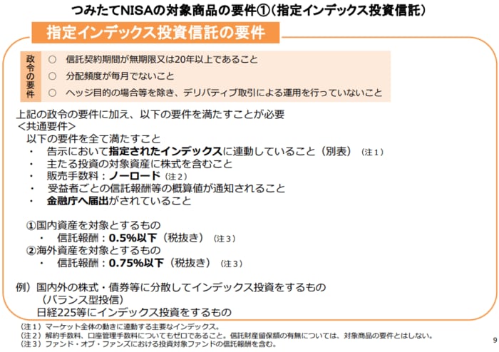 金融庁によると、つみたてNISAのインデックス投信の信託報酬は以下のように定められています。