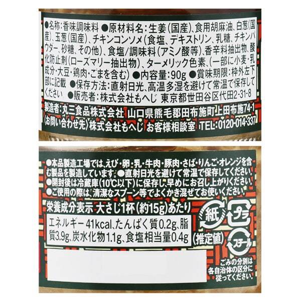 ・原材料:生姜(国産)、食用胡麻油、白葱(国産)、玉葱(国産)、チキンコンソメ(食塩、デキストリン、乳糖、チキンパウダー、砂糖、その他)、食塩/調味料(アミノ酸等)、香辛料抽出物、酸化防止剤(ローズマリー抽出物)、ターメリック色素、(一部に小麦・乳・大豆・鶏肉・ごまを含む)