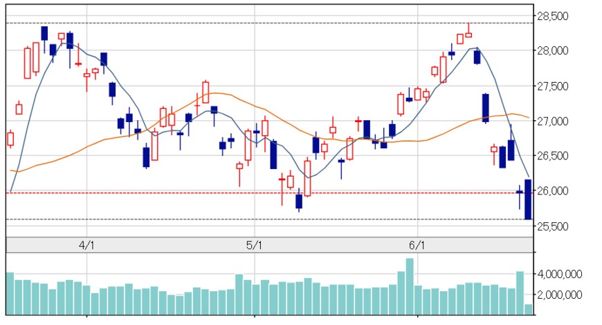 2022年6月17日の東京株式市場で、日経平均株価の終値は、前日比468円20銭安の2万5963円00銭でした。終値ベースで2万6000円を下回るのは5月12日以来、およそ1カ月ぶりです。