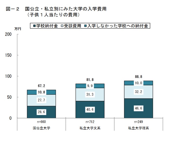 「学校納付金、受験費用、入学しなかった学校への納付金」を合計した入学費用は、国公立大学が67.2万円、私立大学文系は81.8万円、私立大学理系は88.8万円でした。