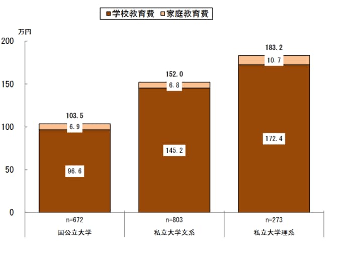 国公立大学が103.5万円、私立大学文系が152.0万円、私立大学理系が183.2万円となっており、最も安い国公立大学と私立大学文系では約1.5倍、同様に私立大学理系では約1.8倍も在学費用に差があります。