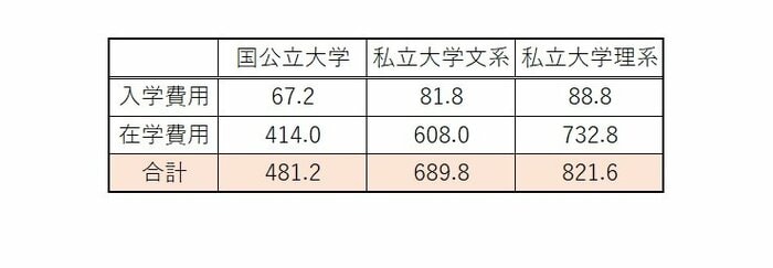 受験費用を含めた入学費用と大学4年間の在学費用の合計を、国公立大学、私立大学文系、私立大学理系の別で見てみると、国公立大学が481.2万円、私立大学文系が689.8万円、私立大学理系が821.6万円となりました。