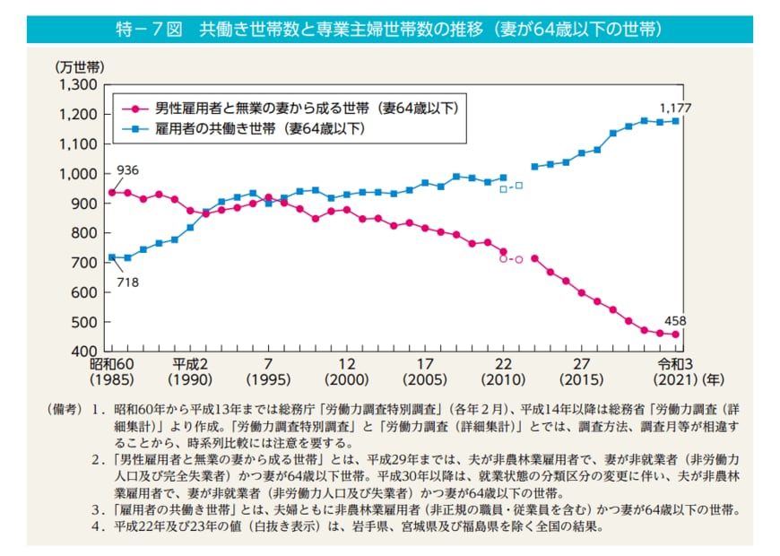 一方で共働き世帯(妻がフルタイム週35時間以上就業・妻64歳以下)は1985年に461万世帯で、2021年には486万世帯と30年以上同程度で推移しています。
