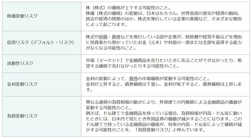 金融庁によれば、投資だけでも以下のように「価格変動リスク」「信用リスク(デフォルト・リスク)」「流動性リスク」「金利変動リスク」「為替変動リスク」があります。