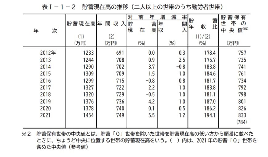 このうち勤労者世帯(二人以上の世帯に占める割合54.9%)について絞ると、貯蓄現在高の平均は1454万円という結果に。