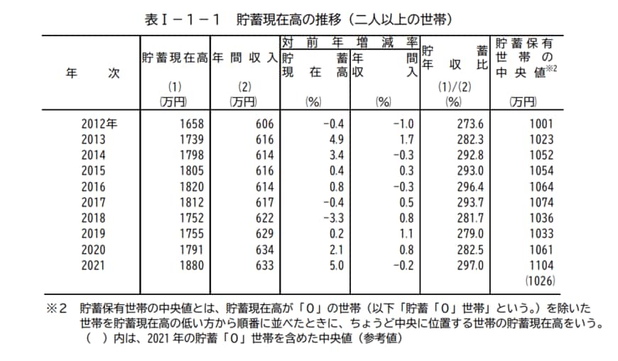 総務省統計局の「家計調査報告(貯蓄・負債編)-2021年(令和3年)平均結果-(二人以上の世帯)」によると、2021年における二人以上世帯の日本人の貯蓄額の平均は1880万円です。