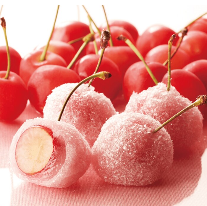 初夏の味わいが感じられる、厳選した国産さくらんぼを使用したさくらんぼ餅で、ピンク色に色付けした求肥でフレッシュなさくらんぼを包み、表面に粉末オブラートと砂糖をまぶしています。さくらんぼの果肉のはじける食感と甘酸っぱさが口の中に広がります。