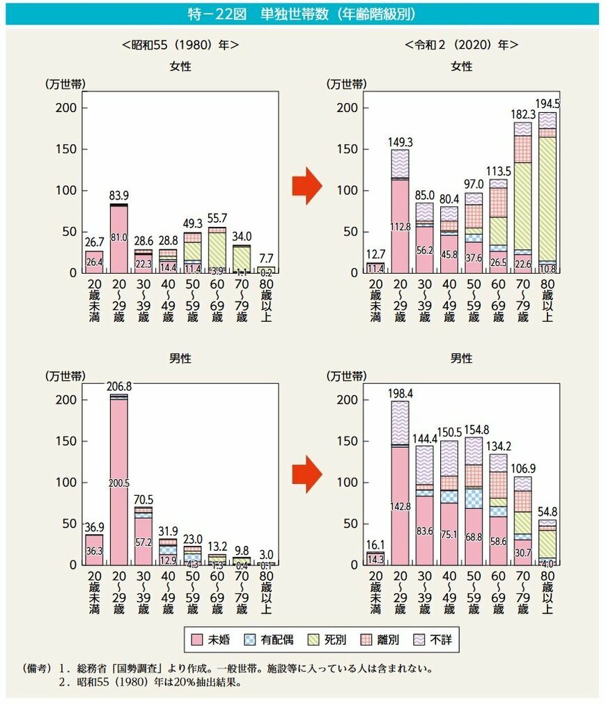 上記によれば、70~79歳男性の単独世帯数は、1980年の9万8000世帯から2020年には106万9000世帯に大きく増加しています。