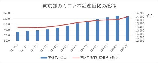 以下のグラフは東京都の人口と不動産価格の推移を比較したものです。東京都では2010年から毎年人口の増加がみられ、それに伴い不動産価格指数も上昇傾向にあります。