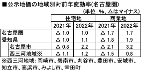 名古屋圏は住宅地が1.0%、商業地が1.7%の上昇と、前年の下落からプラスに転じた。住宅地では名古屋市が高めの上昇率となっており、なかでも中区(9.3%)、東区(4.7%)、南区(4.2%)などの上昇率が高くなっている。また自動車産業の業績回復などを反映し、西三河地域も上昇しており、安城市で3.2%、刈谷市で3.1%のプラスとなった。