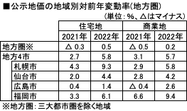 三大都市圏を除く地方圏は住宅地、商業地とも前年のマイナスから2022年はわずかにプラスへ転じたが、札幌、仙台、広島、福岡の「地方4市」は大幅な上昇となっている。なかでも札幌市は住宅地、商業地とも5%台の上昇率となり、福岡市の商業地は9%台だった。