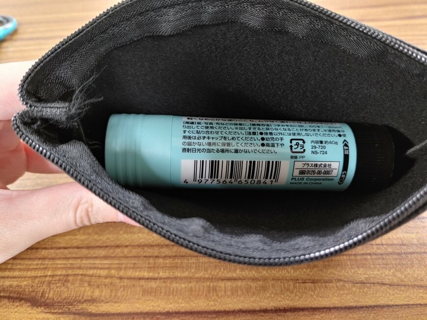 大きさは、10×15センチです。小さめのスマホならば入りそうなサイズ感です。画像のように、大きいスティックのりもすっぽりと入ります。