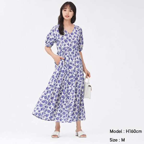 2. トレンドカラーが華やか! 【GU】フラワーVネックティアードワンピース