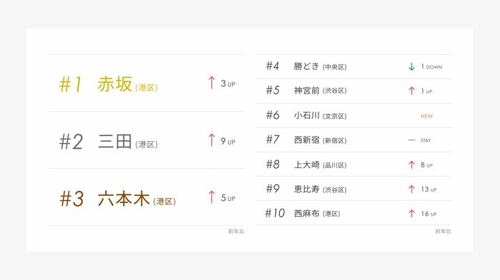 トップ3は赤坂、三田、六本木とすべて港区でした。トップ10を見るとそのうち4つを港区が占めます。
