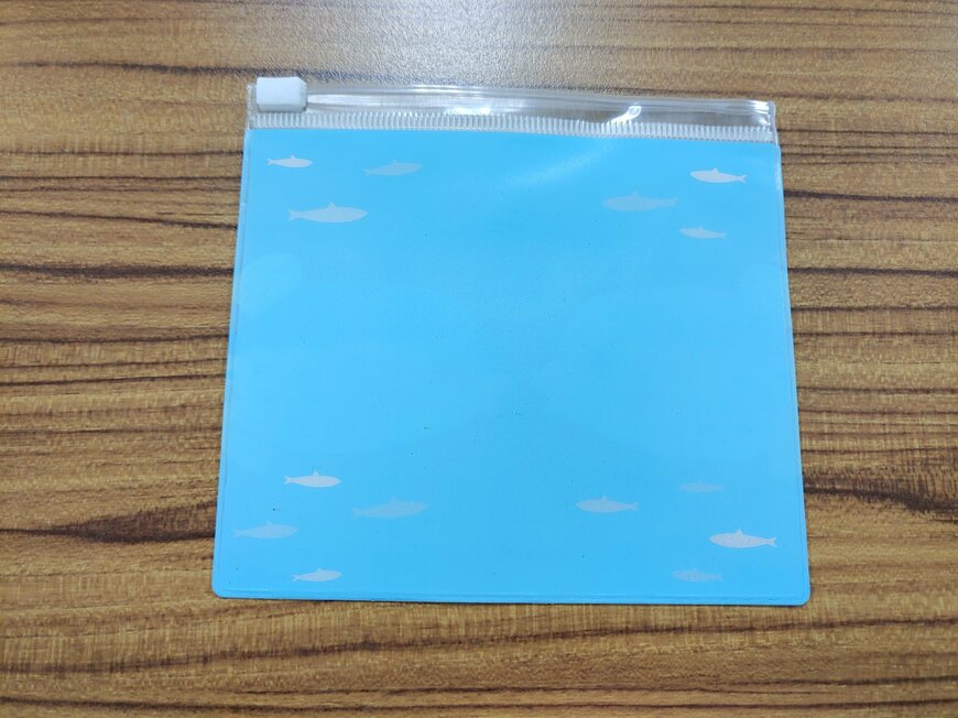100円でありながら、2枚セットで、お得感があります。特に、写真右側の小さいポーチがかわいいですね。ハコフグがいっぱいです。