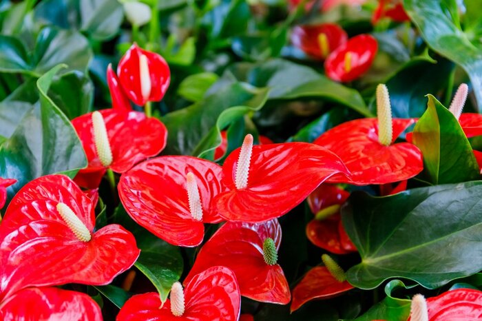 ツヤツヤした照り葉とハート型の花が華やかなアンスリウム。情熱的な赤やカワイイピンクの花色がインテリアのアクセントになります。光が少ない場所でも育つので置き場所を選びません。寒さにはやや弱め。冬の温度管理には気をつけましょう。※参考価格:2000~3000円(4号鉢)