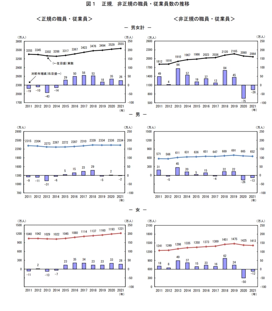 総務省統計局の「労働力調査2021年」によると、2021年平均の正規の職員・従業員数は3555万人と前年に比べ26万人増加(7年連続の増加)する一方で、非正規の職員・従業員数は2064万人と26万人減少(2年連続の減少)でした(2022年2月1日公表)。