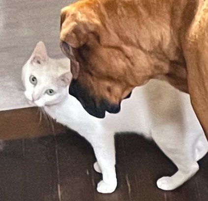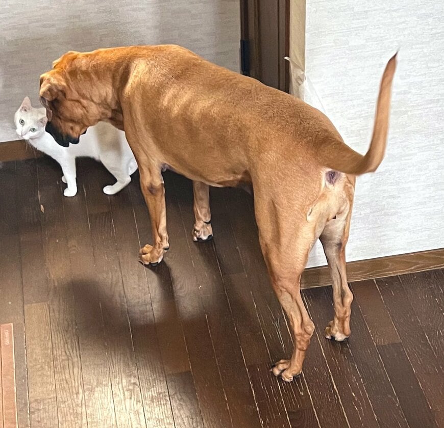 ツイートに「遠慮なく犬のタプタプをガブガブしてると」とあるように、白猫は土佐犬のお腹を噛んだりしていたのでしょうか。