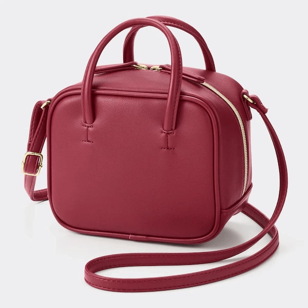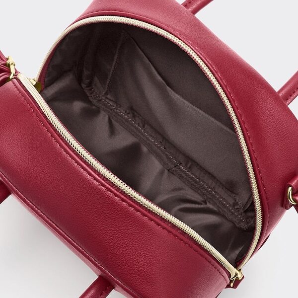 バストンバッグをそのまま小さくしたような形がとてもかわいいミニバッグです。お値段は、なんと1490円です。レザータッチ素材が使われていて、触り心地が良く、高見えもします。