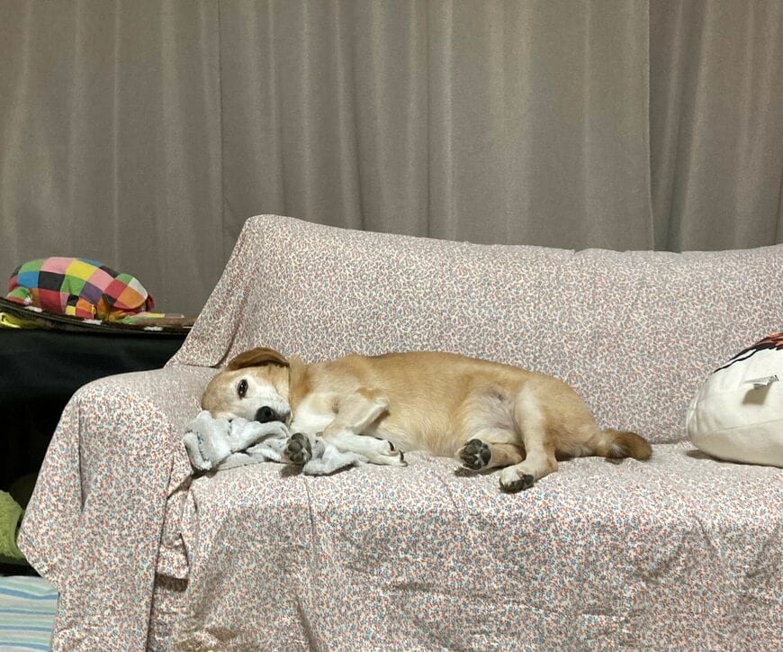 しかし、「うるさいですよ」という文言とともに投稿されたのは、先ほどの犬がうっすら目を開けてこちらを見ている写真です。