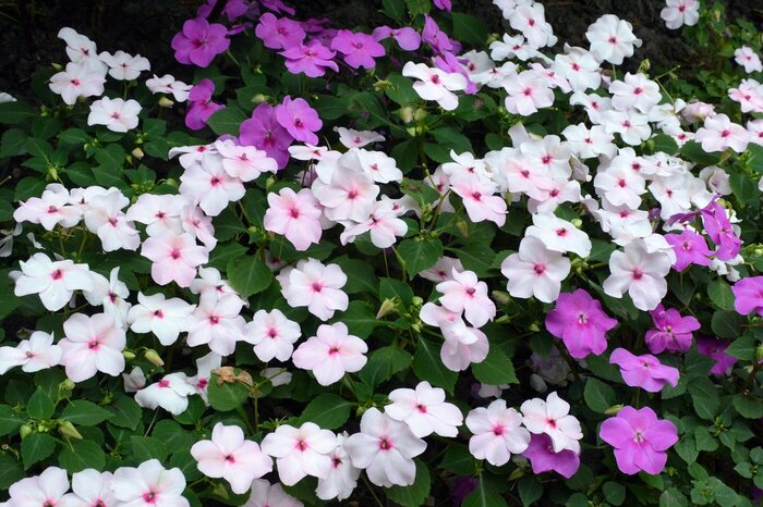 日陰の庭を涼やかにしたいときは、インパチェンスがオススメ。耐陰性が強く、春から秋にかけて長い間花が楽しめます。