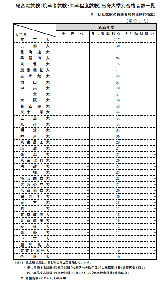 2022年度国家公務員採用総合職試験(春)出身大学別の合格者数とは