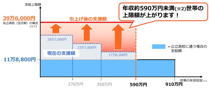 2020年に制度の改正があり、私立高校に通う子どもがいる世帯に支給される金額があがりました。「私立高校授業料の実質無償化」の制度として、私立高校の授業料の平均である、年間39万6000円が原則支給されます。