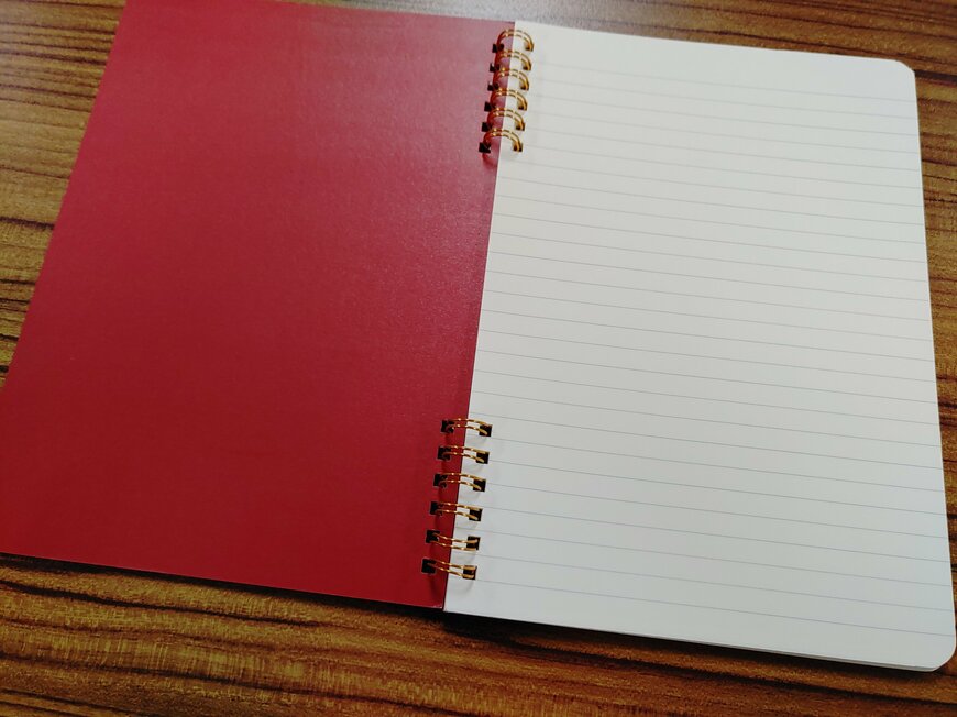 裏表紙は、きれいな赤色。リングの金色が映えて、とてもきれいです。ラグジュアリーな感じがします。