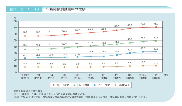内閣府の「令和3年版高齢社会白書(全体版)」によれば、60代の就業率を2002年と2020年で比較すると、以下のようになっています。