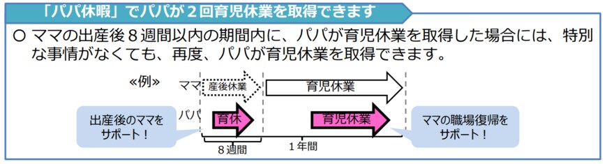 またパパ休暇という制度もあります。パパ休暇の取得は原則1回となっています。しかし、父親が子の出生後、8週間以内に育児休業を取得した場合であれば、特別な事情がなくても、再度育児休業が取得できます。