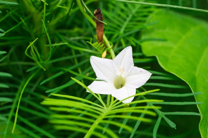 星の形をした小さな花と繊細なレースのような葉が魅力的なルコウソウ。つる性の多年草ですが、耐寒性が弱いため日本では一年草扱いになります。ネットやフェンスに絡ませてグリーンカーテンとして育てることも可能。