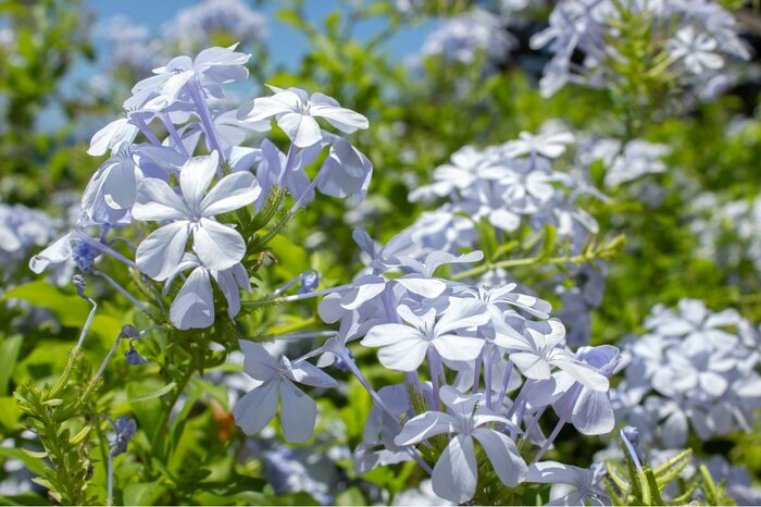 初夏から晩秋にかけ、涼しげな花を次々と咲かせるルリマツリ。樹高0.5~3メートルの常緑低木樹です。生育旺盛でドンドン大きくなるので、小さく育てたい場合は鉢植え、または適度に剪定しながら管理しましょう。