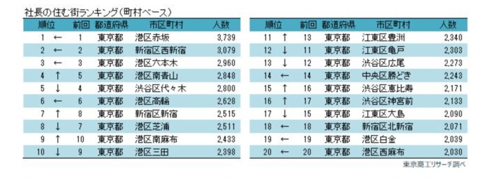 同調査によると、全国約400万社の社長のうち、最も多くの社長が住む街トップは東京都「港区赤坂」で3739人です(※本調査は東京商工リサーチ(TSR)の企業データベース(約400万社)から、社長(個人企業を含む)の居住地を抽出しランキングにまとめている)。