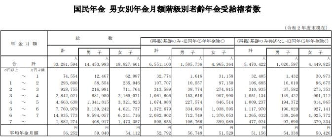 国民年金の受給者は3328万1594人で、全体平均は5万6252円です。国民年金の1万円レンジごとの受給者数は以下の通りです。