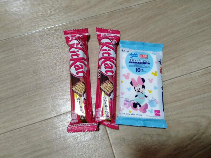 コンビニなどで購入できるもので、どれくらい入るかを実験してみました。画像のように入れてみたところ、チョコバー2本とウェットティッシュが入るサイズ感でした。