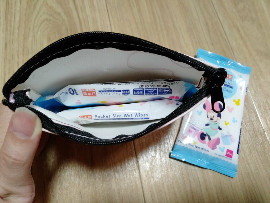 しかも、こちらのポーチは案外ものが入ります。夏に役立つウエットティッシュ(10枚入り)が2つ入るサイズ感です。