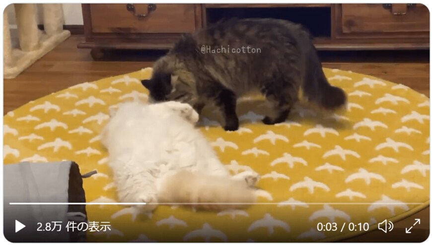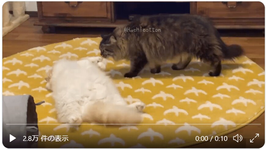 「落とし物チェック」というツイートとともに投稿された動画では、茶色い猫がマットの上のある「落とし物」をチェックしています。