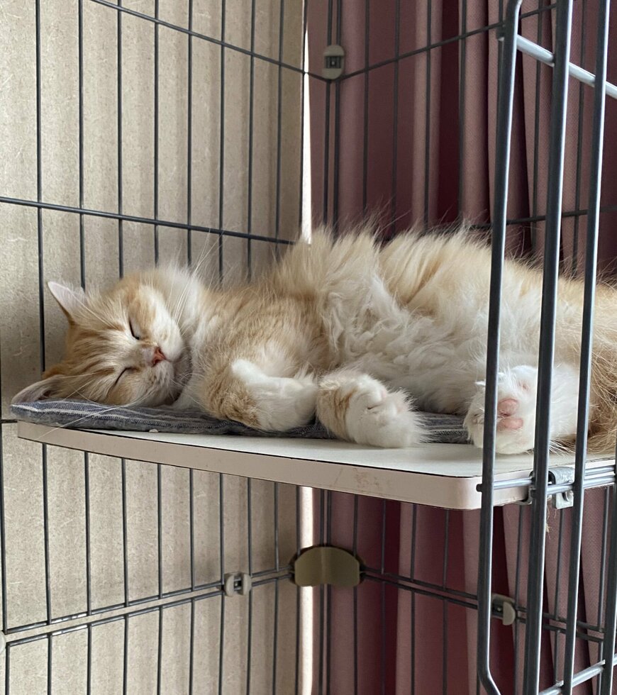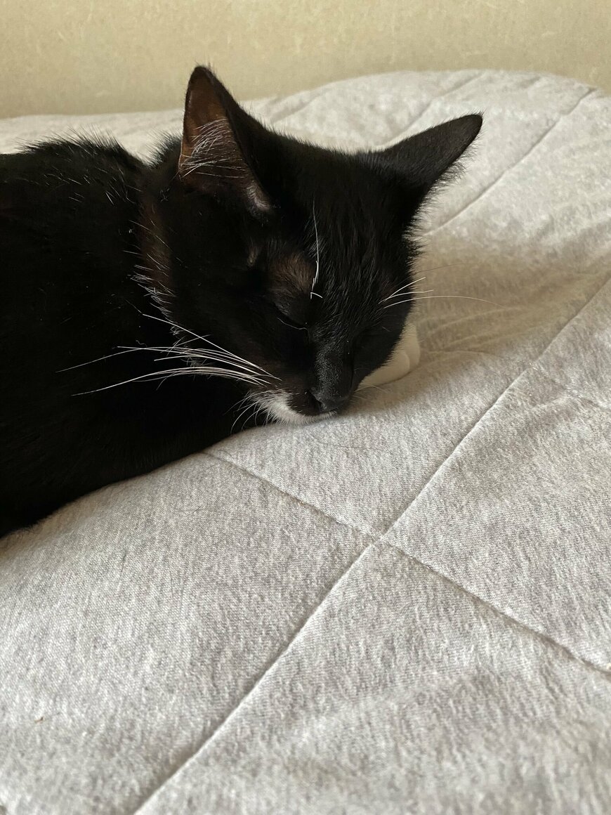 朝ということでお部屋の中は明るいものの、眠っている猫は安らかな表情でぐっすりと寝ています。