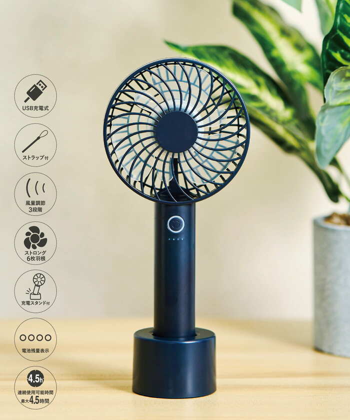 暑い夏の必須アイテム、スタンド付きのハンディファンです。付属のスタンドは、USBコードを接続すると充電スタンドとして使用することも可能。ストロング6枚羽根で風量も3段階の調節ができます。また、便利な電池残量表示付きです。