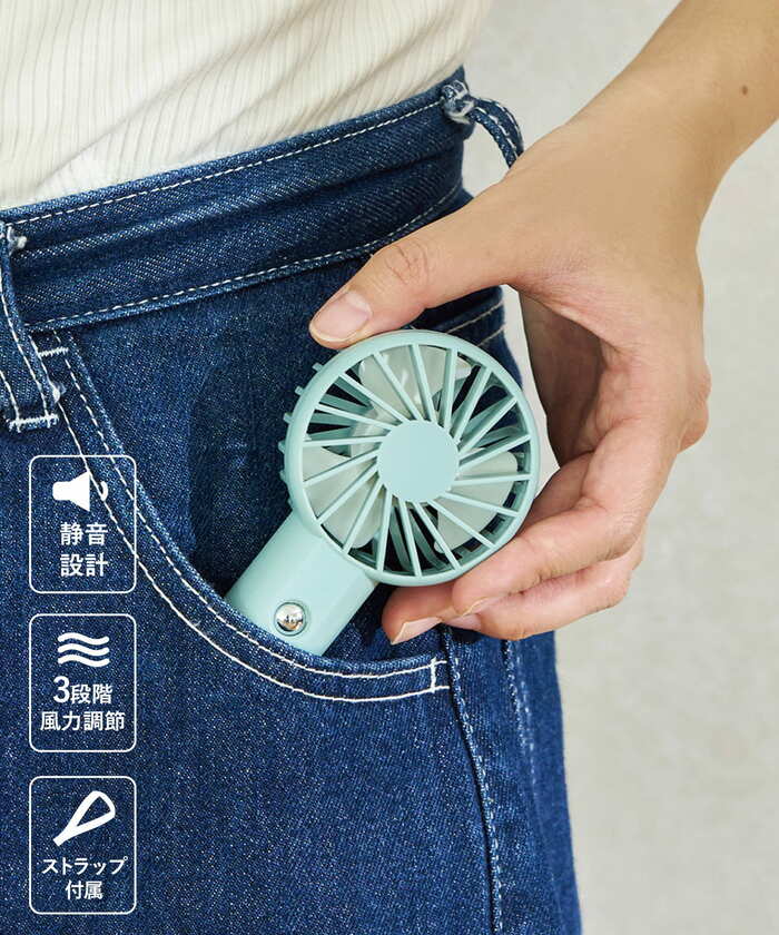 ポケットに入るミニサイズで持ち運びの便利な小さめタイプです。ストラップがついているので首から下げて使用できます。風力を3段階調節できるので、シーンに合わせて好みの風力に合わせてくださいね。