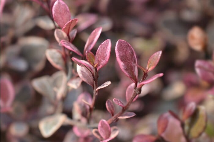 深紅の茎が美しいロフォミルタスは、ニュージーランド原産の常緑低木樹。初夏には白い小花を咲かせ、秋には濃いピンクに紅葉した姿が楽しめます。