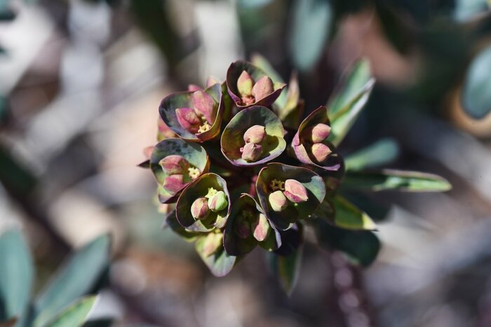 2000種ほどあるユーフォルビア属のなかでも、ユーフォルビア・ブラックバードは特にユニークな品種。スラっと伸びた赤紫の茎に、濃い緑や銅色が入り混ざった葉、春から初夏にかけてメガホンのような個性的な花を咲かせます。
