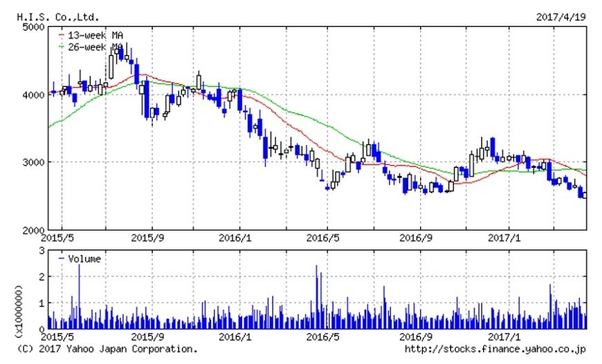 2015年8月に4,765円という高値を付けたH.I.S.株ですが、その後は階段状に下落を開始。下落トレンドを描いています。2016年5月および8~10月にかけては、2,500円付近で下落がストップし、踏みとどまった株価はいったん上昇しています。