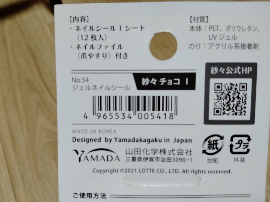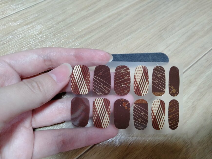 手に入れたので、さっそく開封していきます! 画像のように、ジェルネイルシートと爪やすりが入っています。こちらのアイテムは100円なのですが、ダイソーの他のジェルネイルシールとは、仕様が異なります。