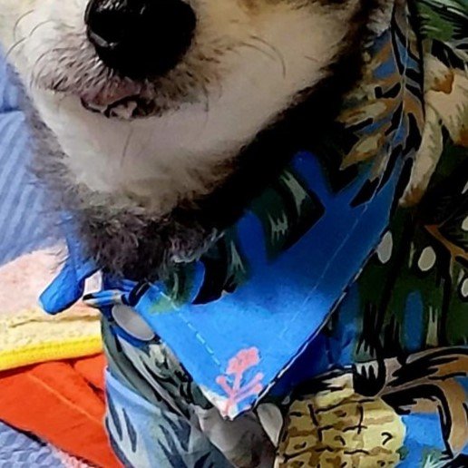 「夏だからアロハシャツ買った親バカ」というツイートともに投稿されたのは、アロハシャツを着た1匹の犬の写真です。